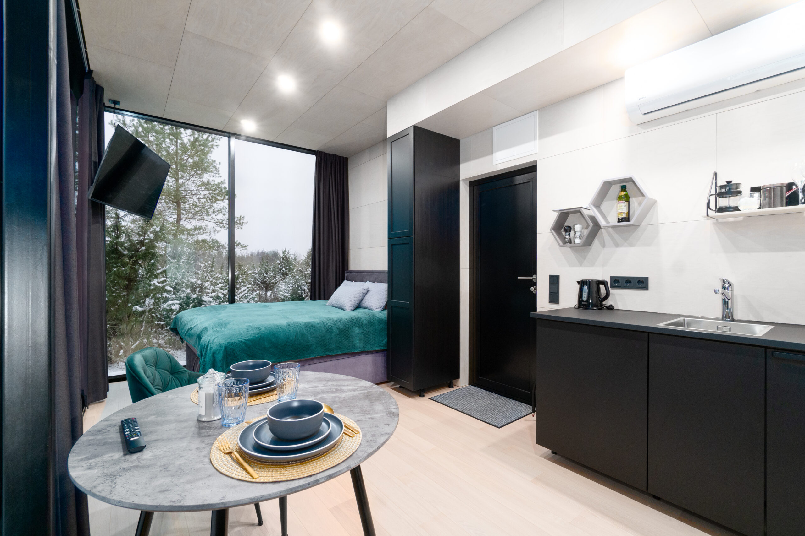 Juniper Minivillas houses are built for year-round use, equipped with air conditioning and heating systems, which means that the house is always at the right temperature regardless of the season. This makes using Juniper holiday homes enjoyable even in winter, when the floor-to-ceiling windows open up to a view of the snow-covered nature.