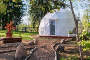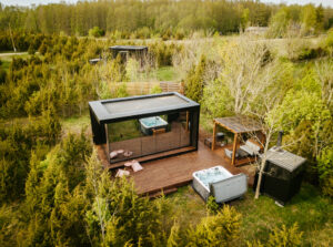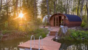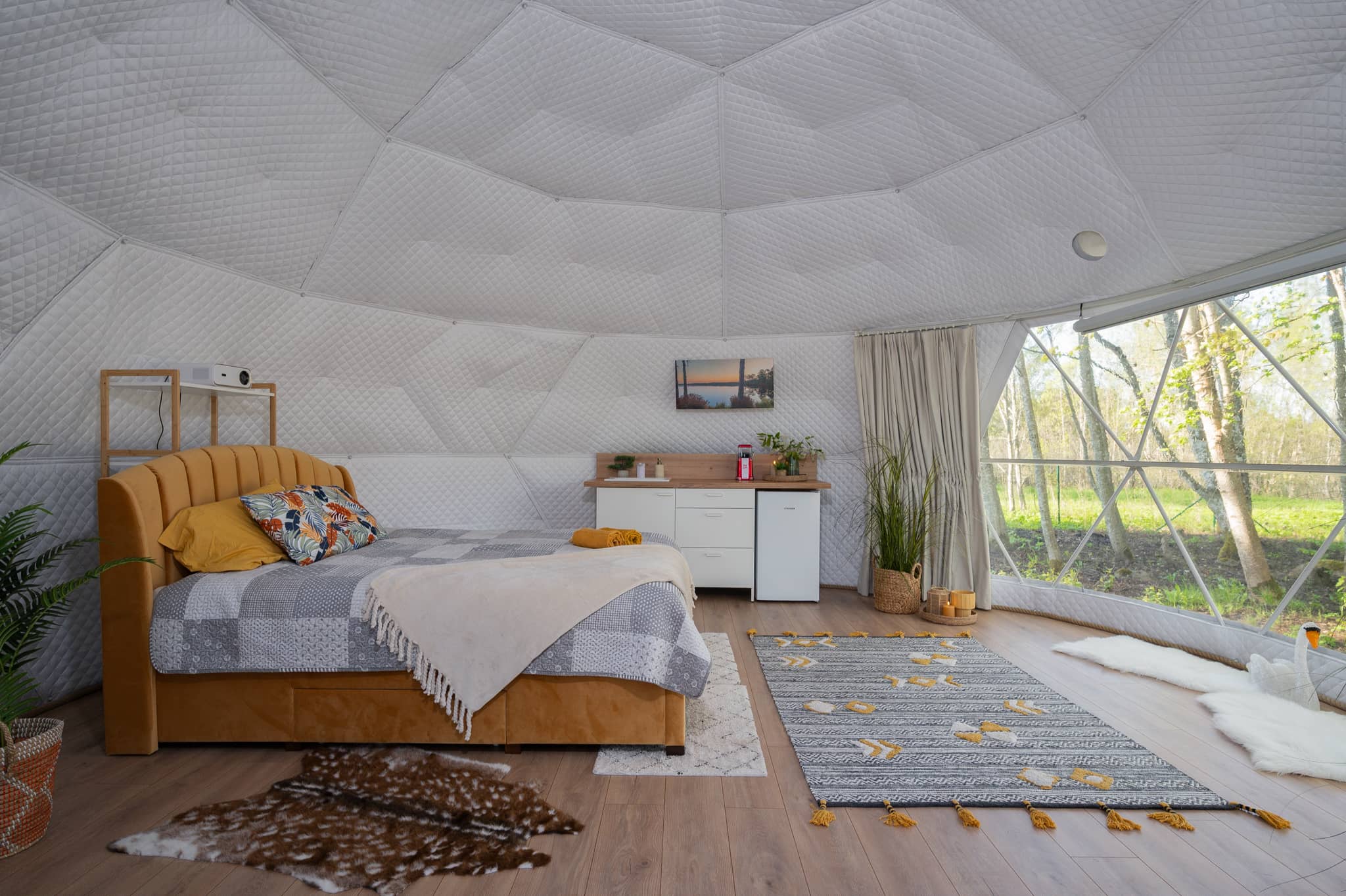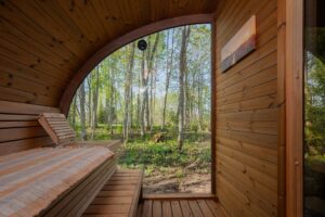 Here, a cozy and beautifully furnished dome house awaits you, offering panoramic views of nature and a glass-walled lakeside sauna by a small pond, where you can cool off both during and after your sauna session or on a hot summer day. Thanks to the large windows, you can feel the presence of nature even while indoors. The connection with nature and the calming green tones have a soothing, stress-relieving, and balancing effect. And, of course, there’s the complete privacy that this place truly offers.